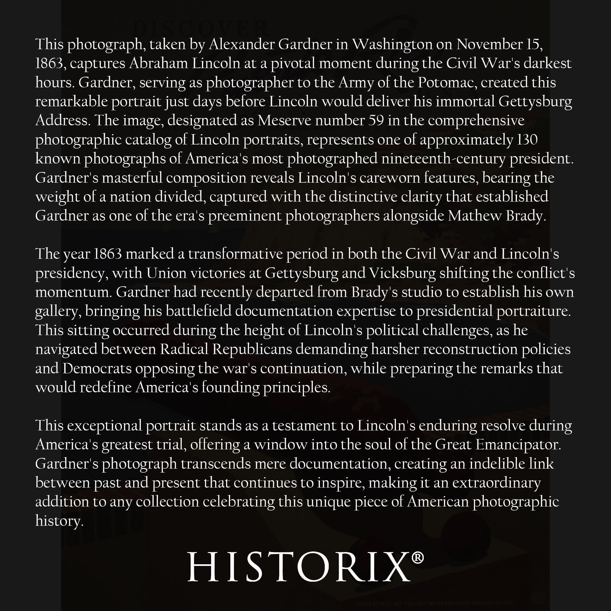 This photograph, taken by Alexander Gardner in Washington on November 15, 1863, captures Abraham Lincoln at a pivotal moment during the Civil War's darkest hours. Gardner, serving as photographer to the Army of the Potomac, created this remarkable portrait just days before Lincoln would deliver his immortal Gettysburg Address. The image, designated as Meserve number 59 in the comprehensive photographic catalog of Lincoln portraits, represents one of approximately 130 known photographs of America's most photographed nineteenth-century president. Gardner's masterful composition reveals Lincoln's careworn features, bearing the weight of a nation divided, captured with the distinctive clarity that established Gardner as one of the era's preeminent photographers alongside Mathew Brady.