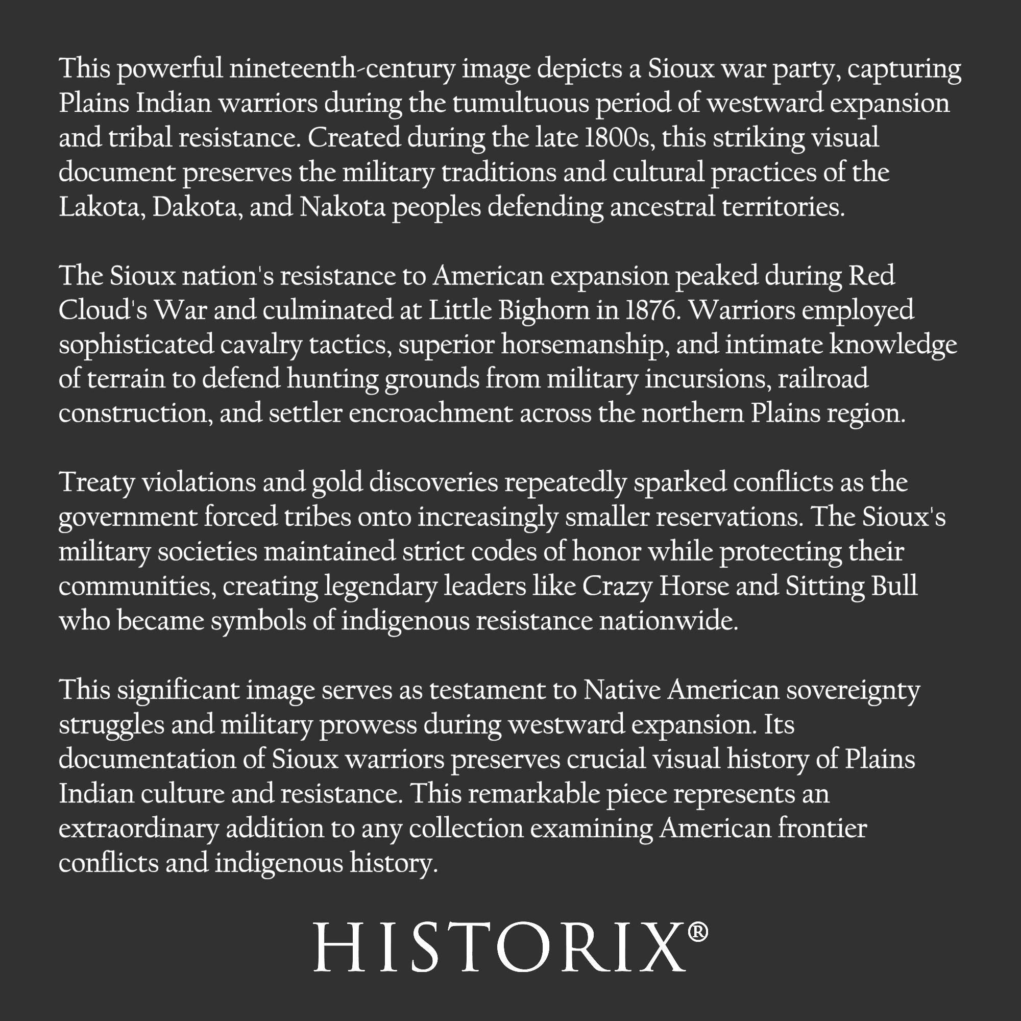 This powerful nineteenth-century image depicts a Sioux war party, capturing Plains Indian warriors during the tumultuous period of westward expansion and tribal resistance. Created during the late 1800s, this striking visual document preserves the military traditions and cultural practices of the Lakota, Dakota, and Nakota peoples defending ancestral territories.