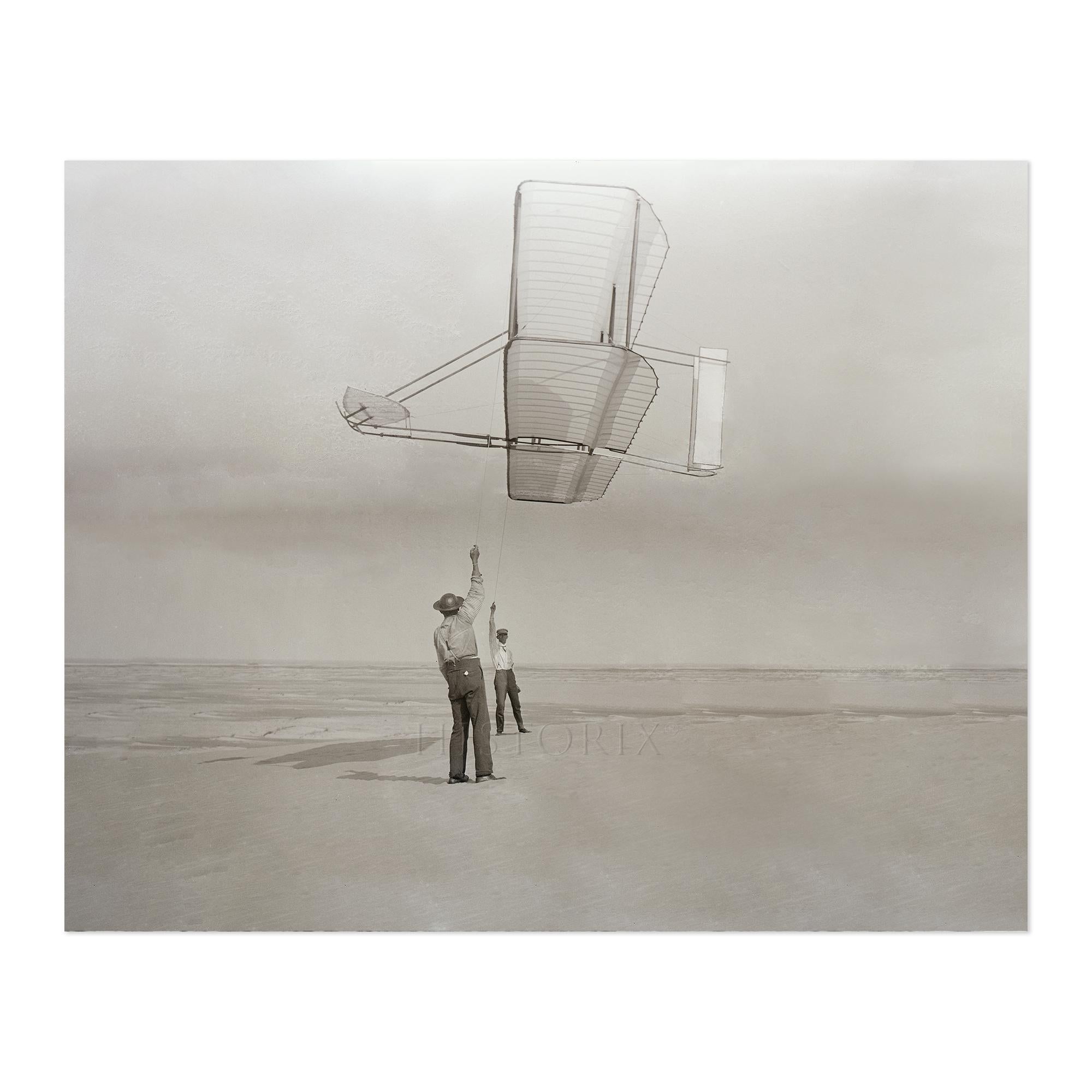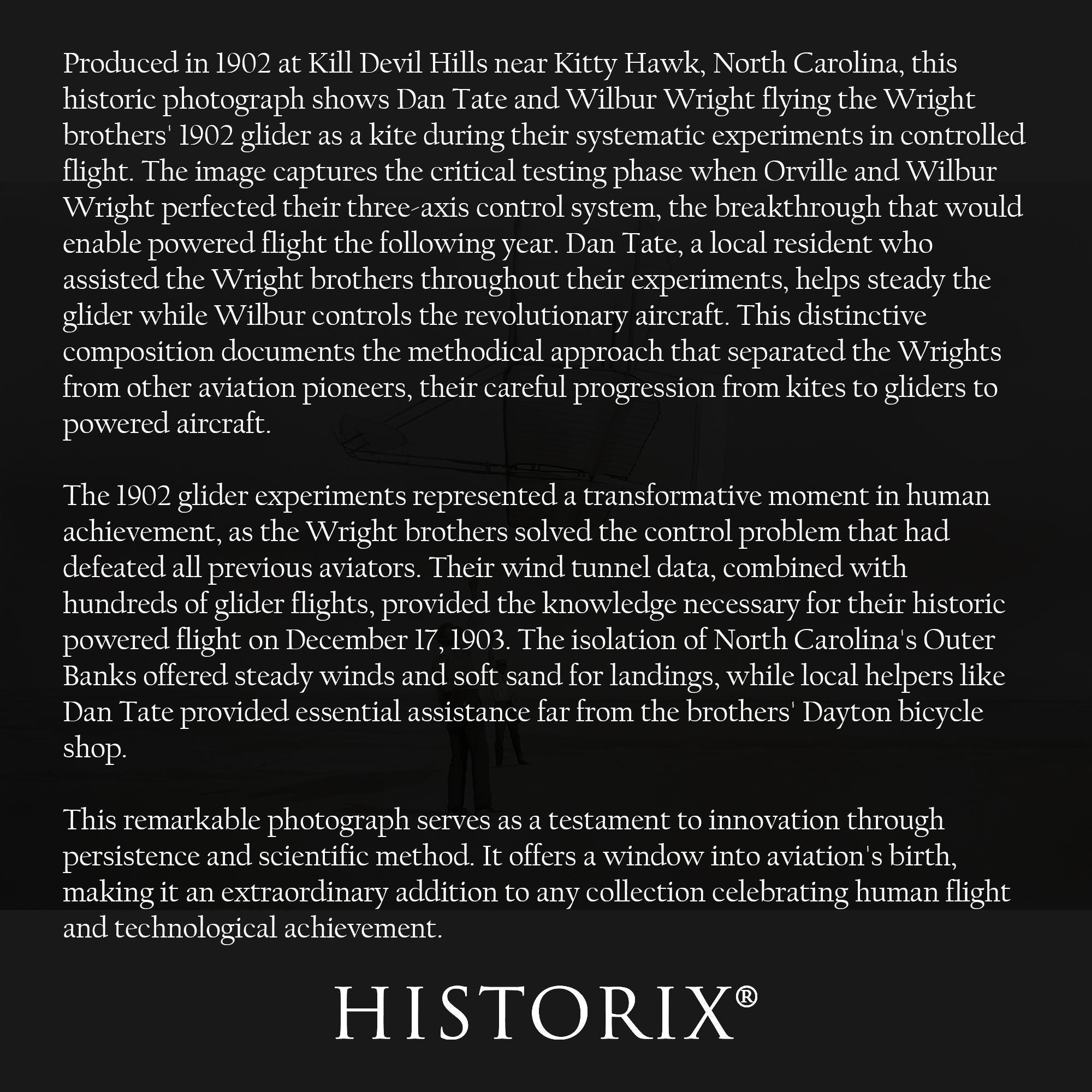 Produced in 1902 at Kill Devil Hills near Kitty Hawk, North Carolina, this historic photograph shows Dan Tate and Wilbur Wright flying the Wright brothers' 1902 glider as a kite during their systematic experiments in controlled flight. The image captures the critical testing phase when Orville and Wilbur Wright perfected their three-axis control system, the breakthrough that would enable powered flight the following year. Dan Tate, a local resident who assisted the Wright brothers throughout their experiments, helps steady the glider while Wilbur controls the revolutionary aircraft. This distinctive composition documents the methodical approach that separated the Wrights from other aviation pioneers, their careful progression from kites to gliders to powered aircraft.