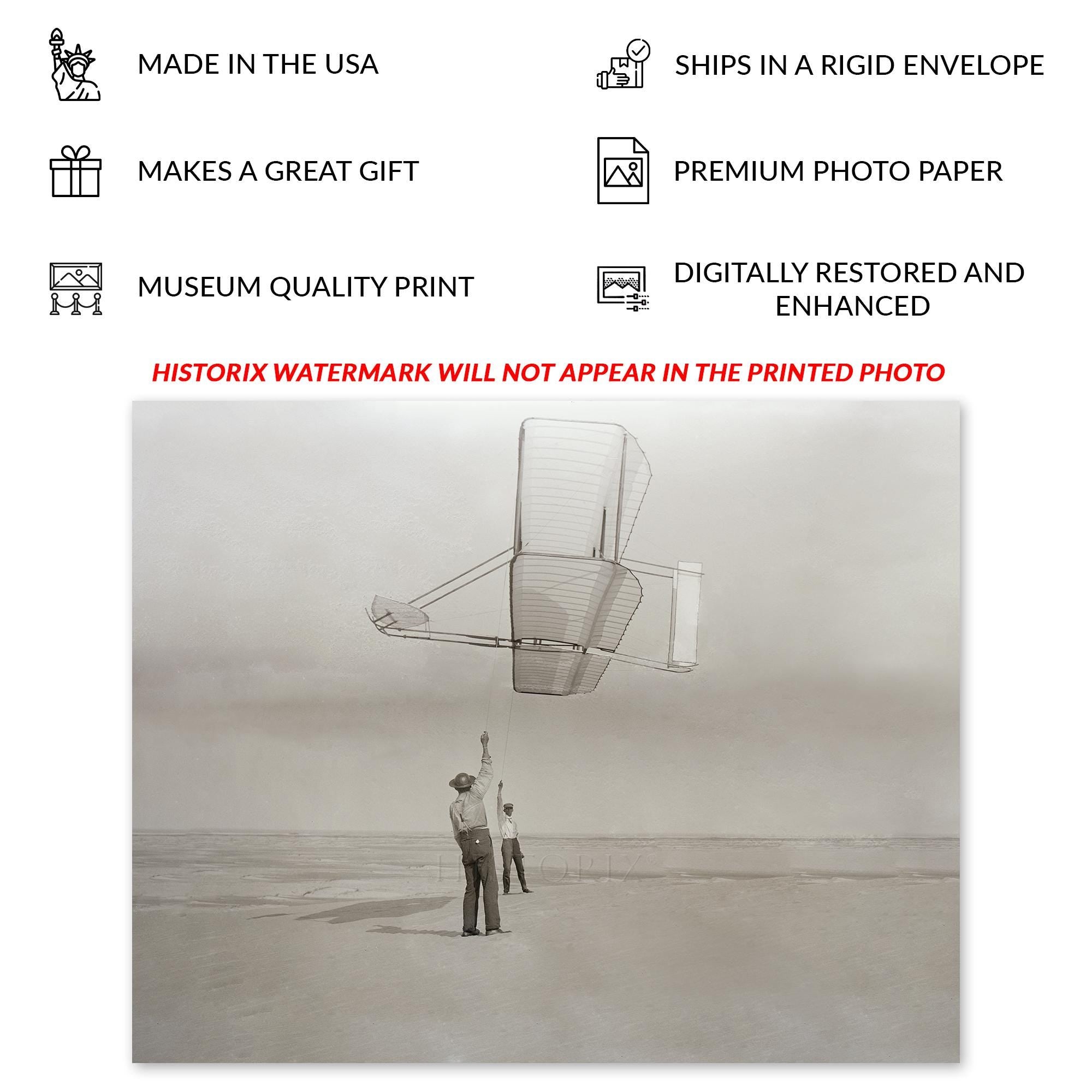 - VINTAGE PRINT REPRODUCTION: Historic reproduction of 1902 Wright Brothers Kitty Hawk Glider Photo. Printed on archival-grade paper that resists fading and discoloration for over 100 years. Perfect for home, office, or gallery display.