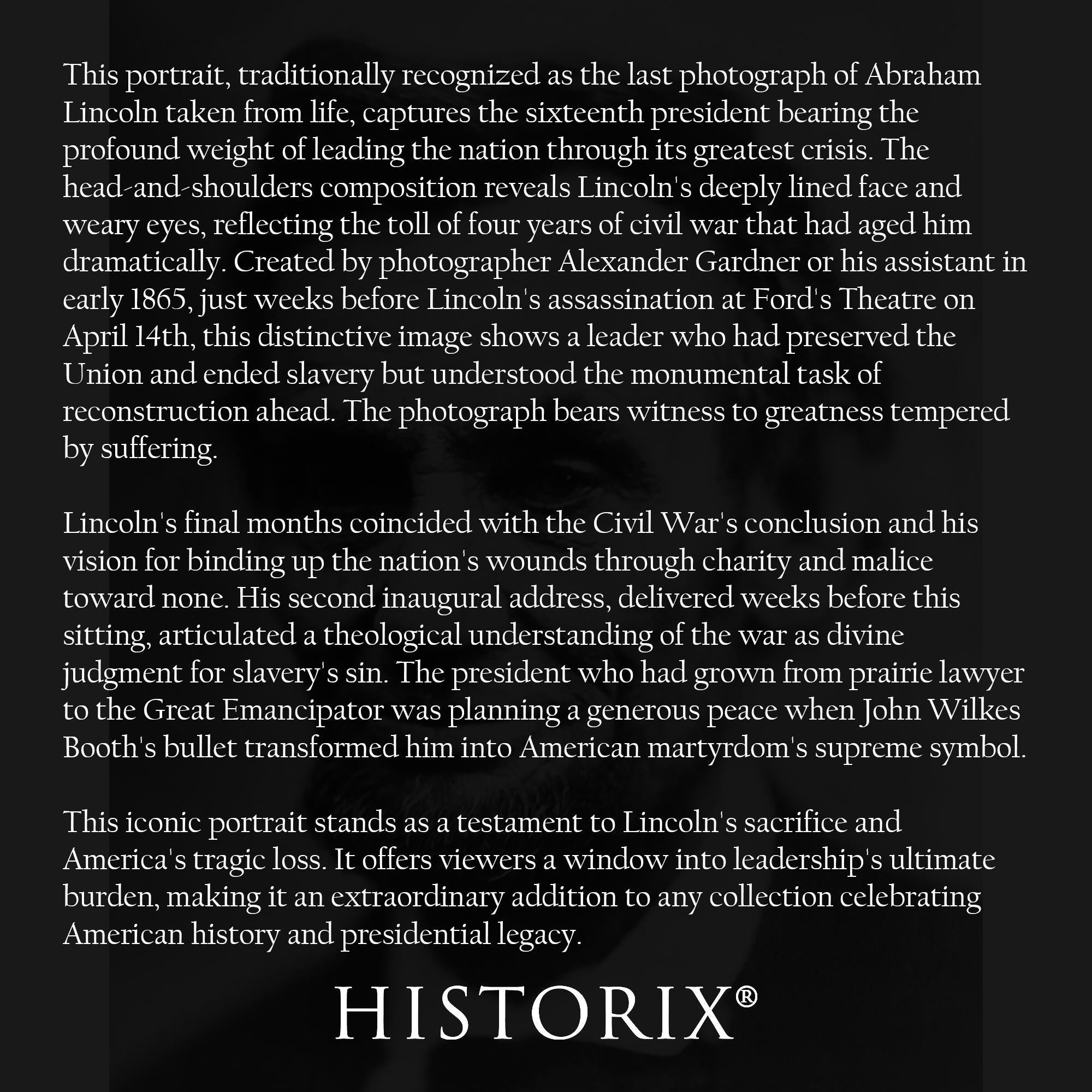 This iconic portrait stands as a testament to Lincoln's sacrifice and America's tragic loss. It offers viewers a window into leadership's ultimate burden, making it an extraordinary addition to any collection celebrating American history and presidential legacy.