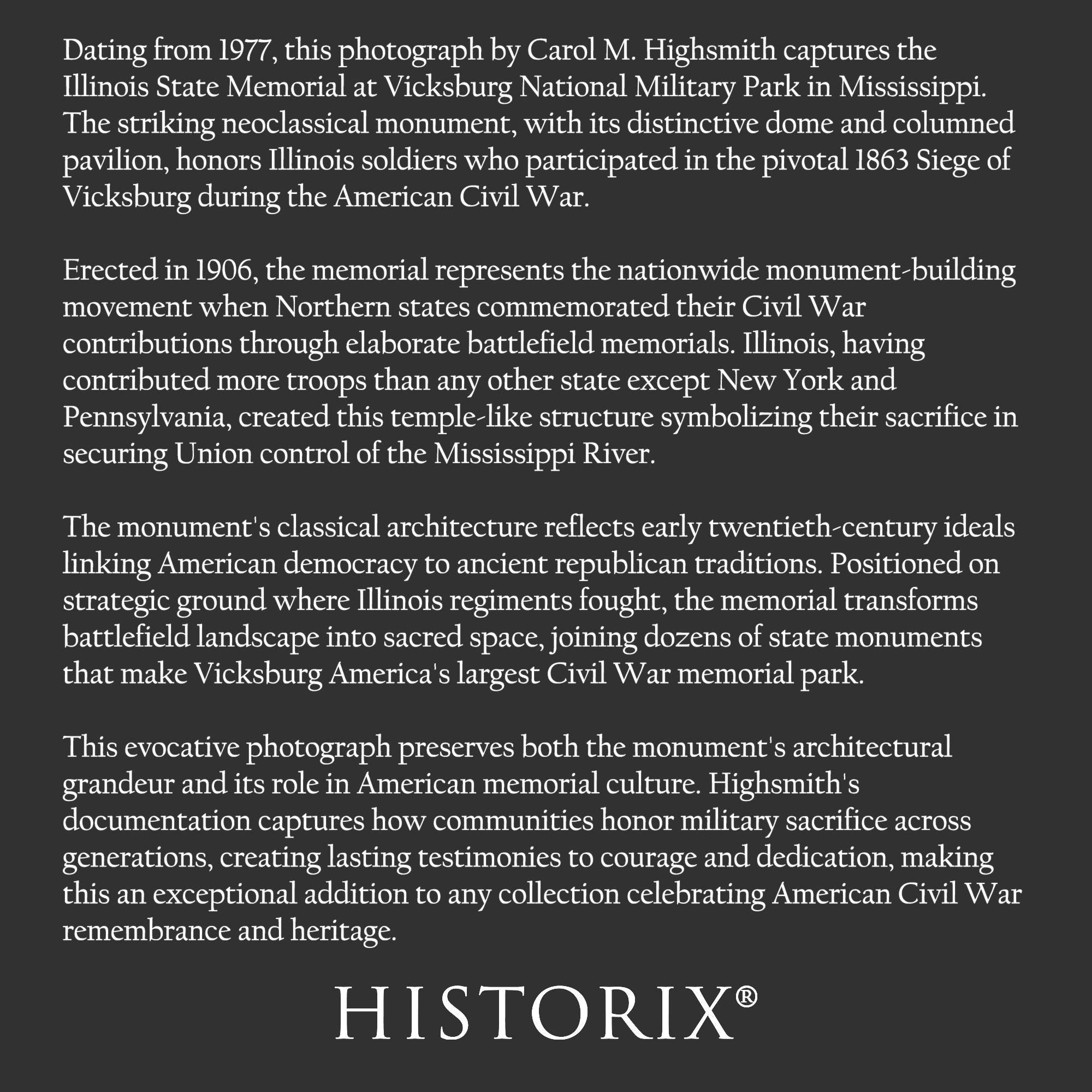 Dating from 1977, this photograph by Carol M. Highsmith captures the Illinois State Memorial at Vicksburg National Military Park in Mississippi. The striking neoclassical monument, with its distinctive dome and columned pavilion, honors Illinois soldiers who participated in the pivotal 1863 Siege of Vicksburg during the American Civil War.