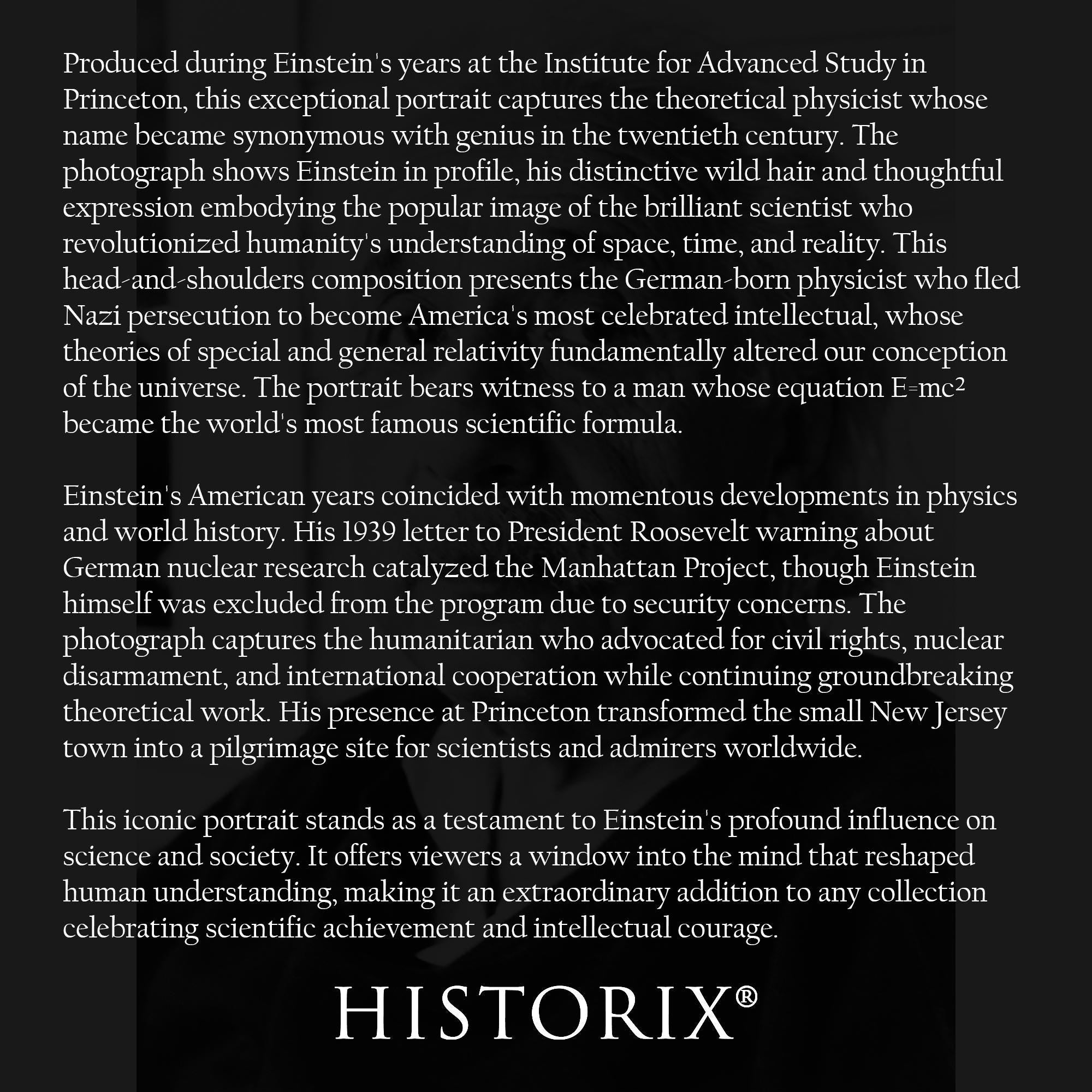 Produced during Einstein's years at the Institute for Advanced Study in Princeton, this exceptional portrait captures the theoretical physicist whose name became synonymous with genius in the twentieth century. The photograph shows Einstein in profile, his distinctive wild hair and thoughtful expression embodying the popular image of the brilliant scientist who revolutionized humanity's understanding of space, time, and reality. This head-and-shoulders composition presents the German-born physicist who fled Nazi persecution to become America's most celebrated intellectual, whose theories of special and general relativity fundamentally altered our conception of the universe. The portrait bears witness to a man whose equation E=mc² became the world's most famous scientific formula.