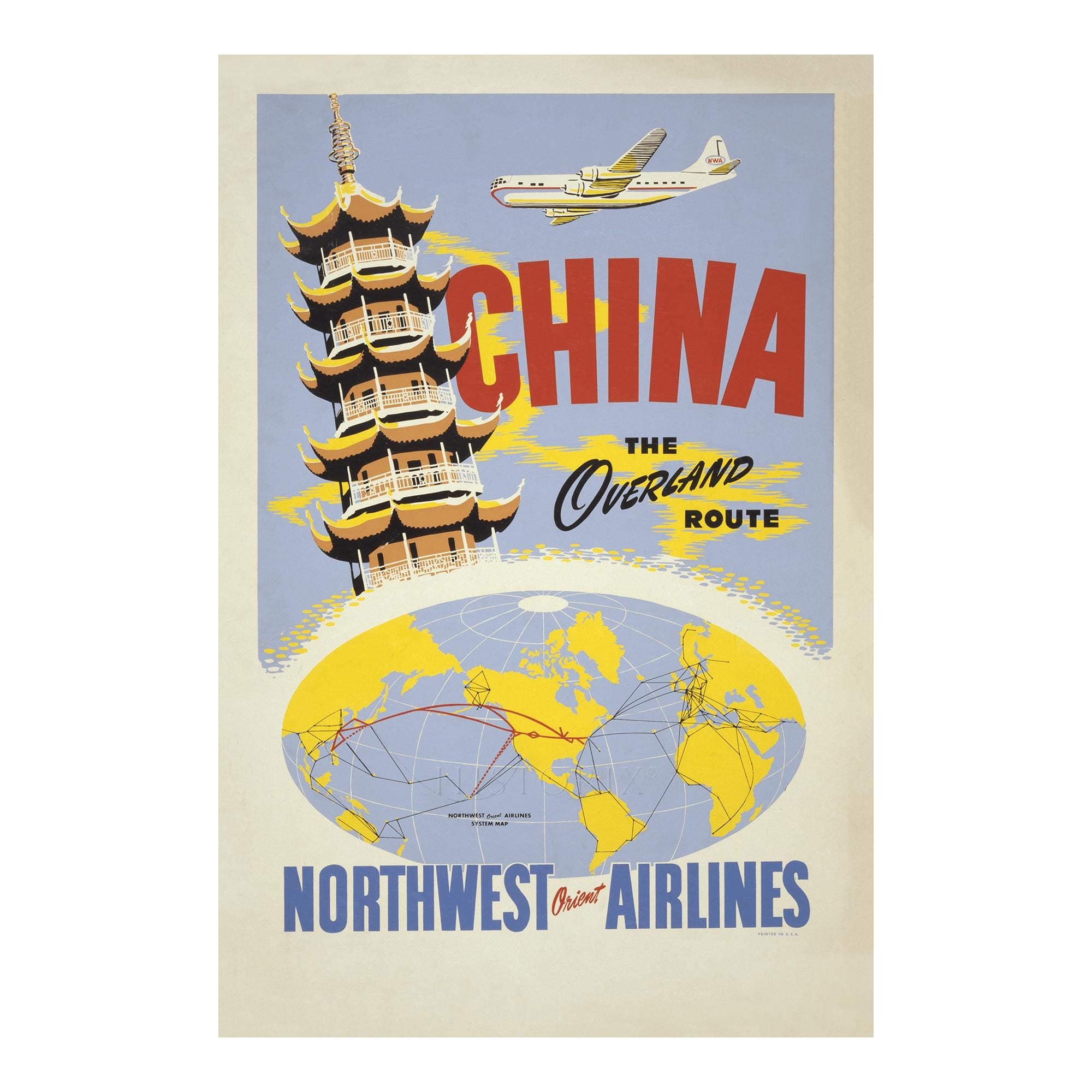 Digitally Restored and Enhanced 1950 China Northwest Orient Airlines Travel Poster - Overland Route Pagoda Map - Mid-Century Transpacific - Archival Print