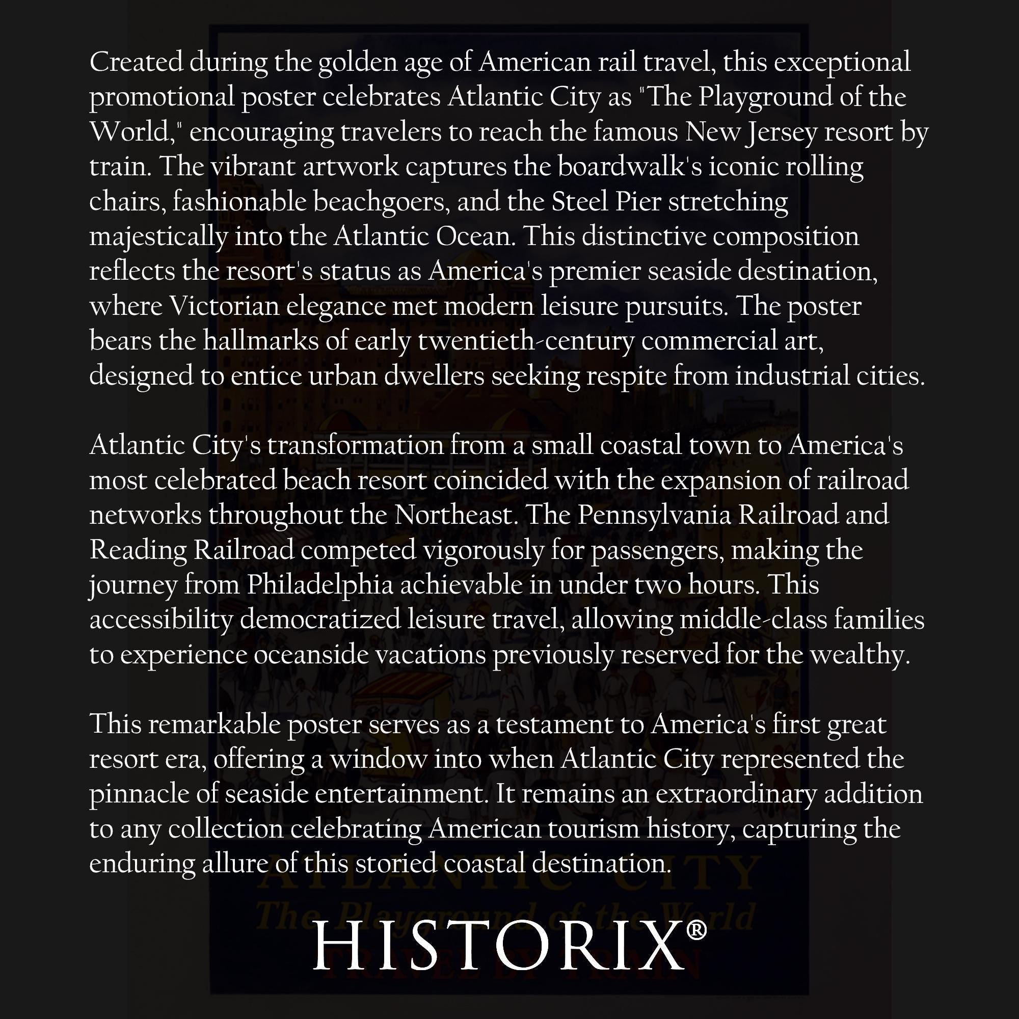 Created during the golden age of American rail travel, this exceptional promotional poster celebrates Atlantic City as "The Playground of the World," encouraging travelers to reach the famous New Jersey resort by train. The vibrant artwork captures the boardwalk's iconic rolling chairs, fashionable beachgoers, and the Steel Pier stretching majestically into the Atlantic Ocean. This distinctive composition reflects the resort's status as America's premier seaside destination, where Victorian elegance met modern leisure pursuits. The poster bears the hallmarks of early twentieth-century commercial art, designed to entice urban dwellers seeking respite from industrial cities.